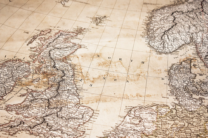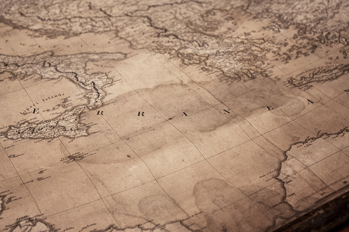 Carta intelata e applicata alle estremità superiori e inferiori a bacchette di legno. Una macchia con gora intensa e tracce di fango che interessano la Gran Bretagna e il Mare del Nord, altre gore e lievi bruniture sparse, ma nel complesso condizioni generali discrete. Il meccanismo di apertura della carta non è funzionante.