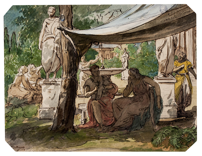 Tito Agujari, Scena classica. Penna, inchiostro e acquerello su carta....