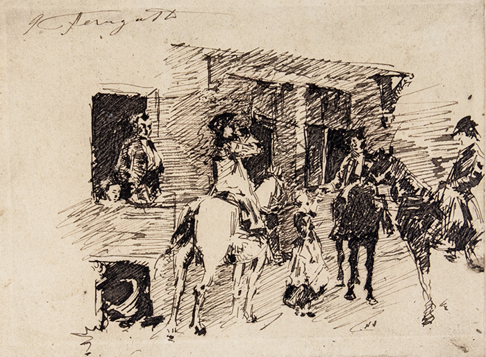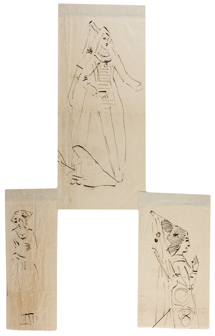 1-3) Figure femminili in abiti medievali. Penna e inchiostro di china. mm 215x90; mm 145x55; mm 140x75. SI AGGIUNGE: Adolfo Ferraguti Visconti, Scena di genere. Penna e inchiostro di china su carta. mm 93x125. Firmato a penna in alto a sinistra. Ex collezione editore Cerastico Milano. (4)