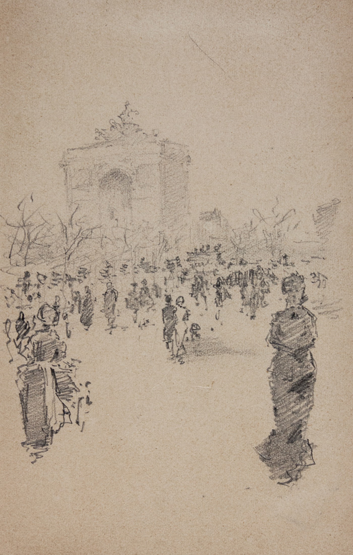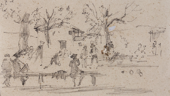 1) Personaggi in piazza San Gallo a Firenze. Matita di grafite su carta. mm 155x100. 2) Veduta di paese con figure. Matita di grafite su carta. mm 60x100. (2)