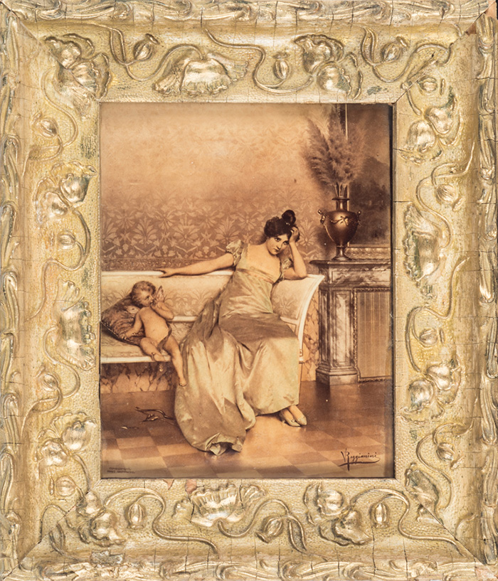 Vittorio Reggianini, Figura femminile seduta con amorino. Olio su vetro....