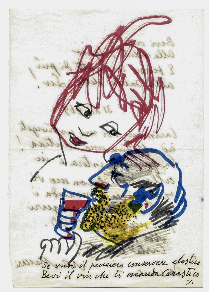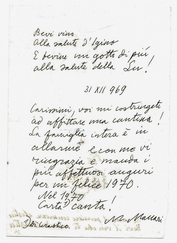 “Bevi vino / alla salute d’Igino / E bevine un gotto di più / alla salute della Lu! […]. Se vuoi il pensiero conservare elastico / bevi il vin che ti manda Cerastico”.