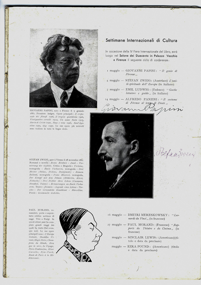Firme autografe di Zweig, Giovanni Papini e dello scrittore russo Dimitri Mereskowsky. SI AGGIUNGE: Menù della "Cena offerta dal Presidente dell'Azienda di Turismo in onore di Giovanni Papini e Stefan Zweig [...]. Pozzo di Beatrice 2 maggio 1932. (2)