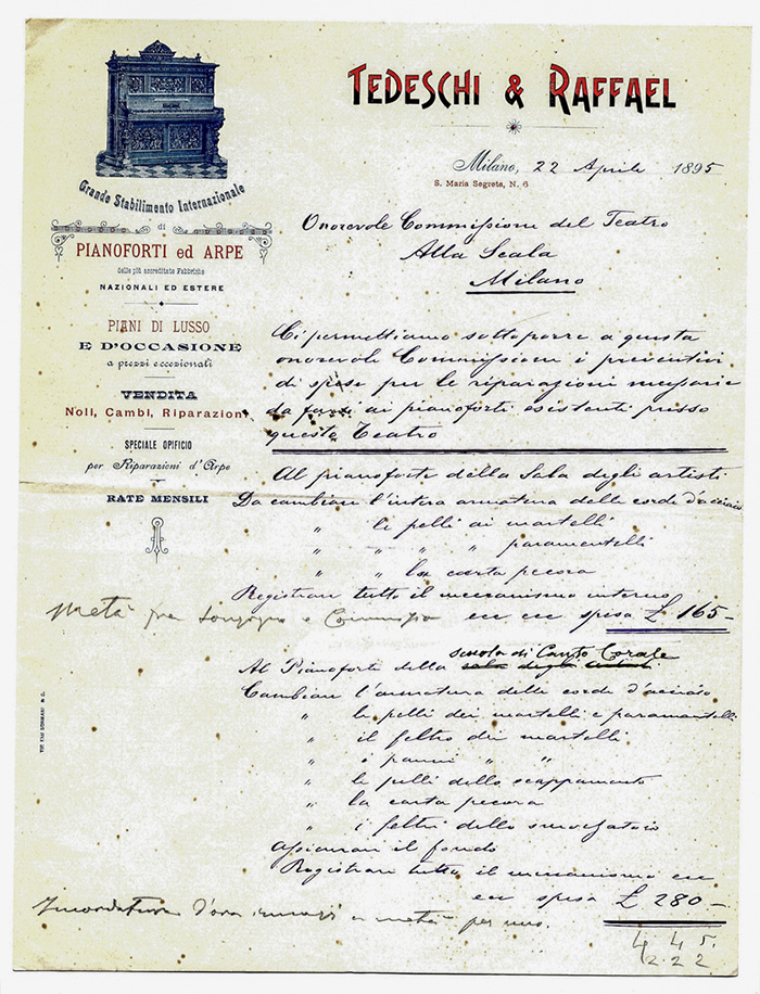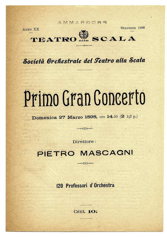 Sulle locandine e sui programmi di sala è indicato il nome di Pietro Mascagni (direttore). Alcuni concerti di inizio '900 sono diretti da Vittorio Maria Vanzo. Insieme alle locandine anche alcuni preventivi per il Teatro alla Scala (su carte intestate) di spese per accordature, riparazioni ecc. SI AGGIUNGE: Uno spaccato del Teatro alla Scala con le file e la numerazione dei palchetti. Datato 1921-1922. (33)
