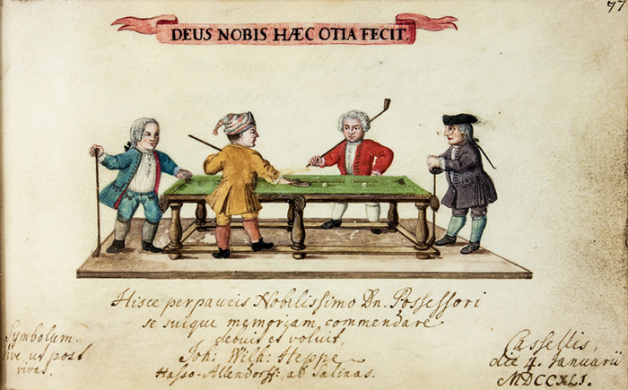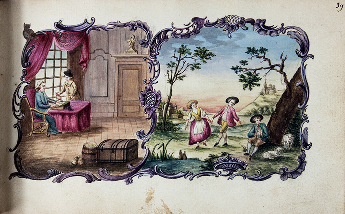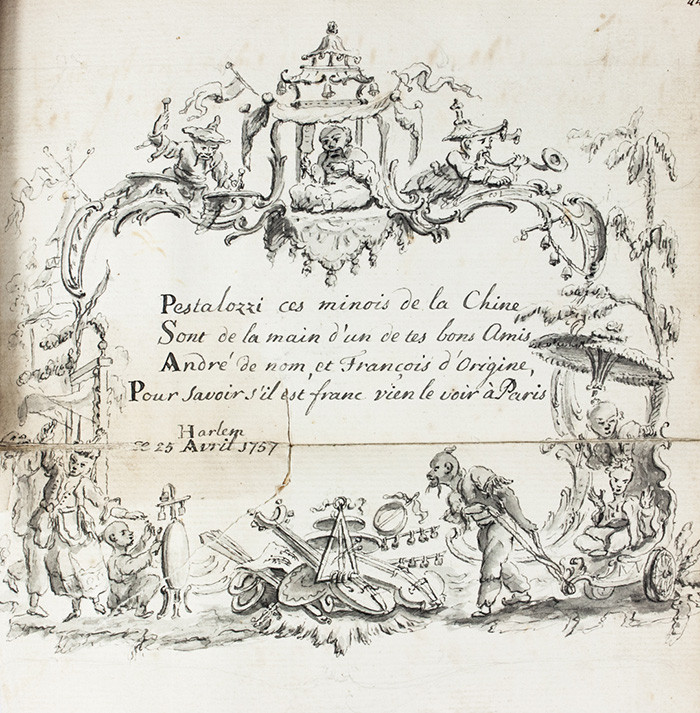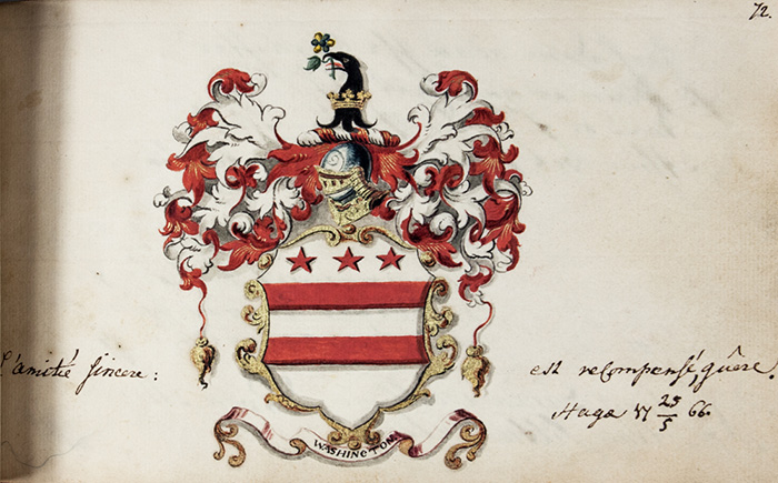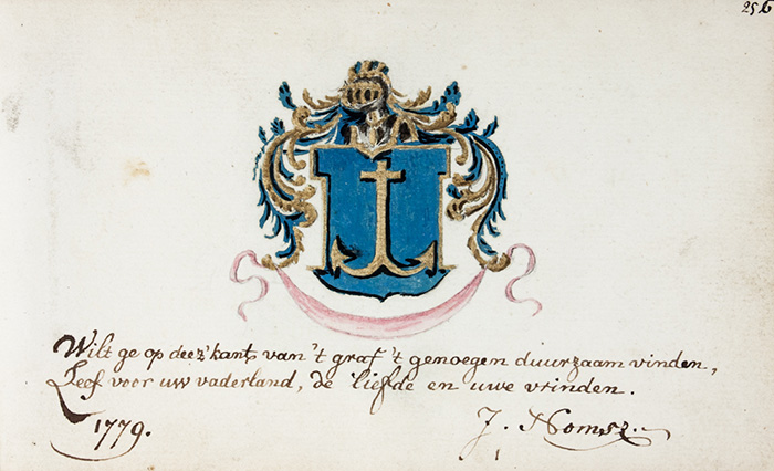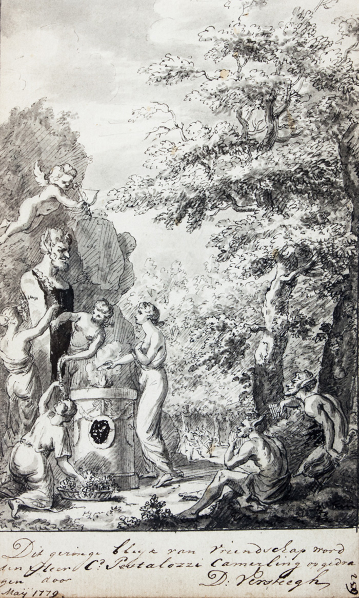 Splendido album amicorum di Conrad Pestalozzi Camerling (nobile olandese autore di una Dissertatio juridica inauguralis de dotalitio ob abusum non tollendo) in cui sono raccolte le dediche a lui indirizzate dal 1739 al 1781 recanti gli indirizzi di Amsterdam, Den Haag, Haarlem, Leyden e Rinteln: nella seconda pagina si legge «Hic liber ingenius est consecratus amicis a quibus [...] quos mihi conjunxit favor et confidentia, virtus... Conradus Pestalozzi Camerling huius philotheca possess. Rintelii 1739». Oltre alle innumerevoli attestazioni di stima e di affetto da parte di amici ed esponenti della nobiltà olandese e non solo del tempo, questo liber amicorum è impreziosito da decine di stemmi finemente disegnati e in coloritura coeva, fra i quali quello della famiglia Washington accompagnato dalla dedica «l'amitié sincere: est recompensé, guêre. Haga 25.05.1766», e da molti disegni di bella fattura, alcuni firmati da rinomati artisti del tempo. A carta 18r Dirk Van der Aa (1731-1809) ha disegnato a penna e inchiostro, anche acquerellato, una graziosa scena di puttini con cornucopia adagiati in un soffice tappeto di nuvole, preceduta da una lunga dedica datata 1765 (c. 17v); a carta 152r Johan Van Gool (1685-1763) ha realizzato a penna e inchiostro acquarellato una scena con buoi datata 1745; Willem Joseph Laquy (1738-1798) ha disegnato una scena pastorale a carta 248v. Fra le curiosità si menzionano a carta 77 una graziosa raffigurazione a colori di 4 nobiluomini intenti nel gioco del biliardo; le maschere della Commedia dell'Arte a carta 95v, un grazioso disegno firmato Van Bergh (?) pudicamente censurato raffigurante un sacrificio di una giovane donna all'erma di Pan a carta 259r e un calligramma a carta 255v dove le frasi della dedica di Ottens e De Wilde dipingono un cane seduto.