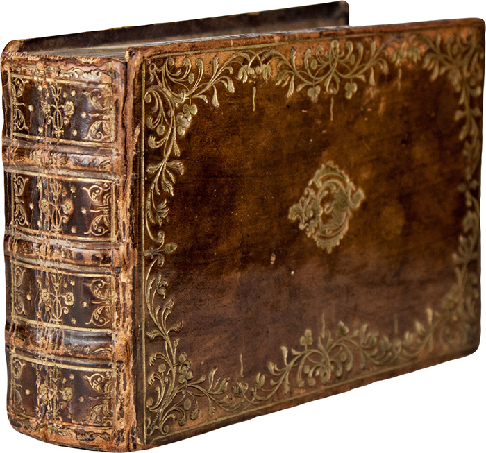 Manoscritto cartaceo e pergamenaceo in-8° oblungo (mm 178x105). Carte 3 bianche, [1] con lo stemma della famiglia Pestalozzi Camerling, 263 numerate a mano, [5] di indice. L'ordine delle dediche non è strettamente cronologico e la numerazione di alcune carte è stata corretta, ma l'opera presenta comunque una legatura del tempo. Manoscritto con centinaia di dediche e firme, stemmi acquarellati e talvolta con rialzi in oro, disegni e fregi. Ottima conservazione. Legatura coeva in piena pelle con elaborata cornice floreale impressa ai piatti e piccolo fregio centrale, decori floreali anche ai comparti del dorso a 3 nervi; piatto posteriore molto allentato e altre minime mende. Nota di possesso Sarah Heckford manoscritta al contropiatto anteriore.