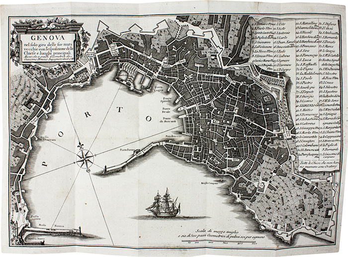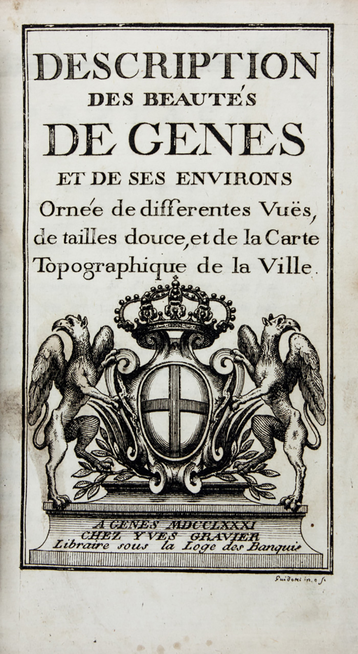 In-8° (mm 175x110). Pagine [2], 142, [2] con 19 (di 20) tavole di vedute, piante e carte geografiche di cui la maggior parte ripiegate. Manca la veduta del Palazzo Doria-Pamphili. Buon esemplare, purtroppo scompleto di una tavola e con uno strappo ben riparato alla grande mappa di Genova. Legatura moderna in mezza pelle con titoli dorati al dorso.