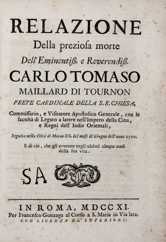Relazione della preziosa morte dell'eminentiss. e reverendiss. Carlo Tomaso Maillard di Tournon [...] seguita nella città di Macao li 8. del mese di Giugno dell'anno 1710. E di ciò, che gli avvenne negli ultimi cinque mesi della sua vita...