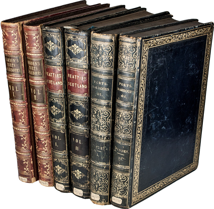 2 volumi in-4° (mm 267x204). Pagine [4], 188; [4], 155, [1] con 2 frontespizi figurati e 124 tavole fuori testo incise in acciaio. Fioriture sparse a tratti intense. Legatura coeva in piena pelle verde con cornici a secco e in oro ai piatti, titoli dorati su tassello al dorso; alcune spellature alle estremità. SI AGGIUNGE: altra copia, in 2 volumi rilegati in pelle rossa. SI AGGIUNGE: Id., Scotland illustrated in a series of views taken expressly for this work by T. Allom, W.H. Bartlett and H. M'Culloch [...]. Vol. I (-II). London: George Virtue, 1838. 2 volumi in-4° (mm 272x210). Pagine [8], 200; [4], 164 con 2 frontespizi figurati, 1 mappa più volte ripiegata e 116 (di 118) tavole fuori testo incise in acciaio. Fioriture sparse ma buona copia. Legatura coeva firmata J. Morrison in piena pelle verde con elaborate cornici a secco e in oro ai piatti, titoli dorati su tassello al dorso; qualche menda. (6)