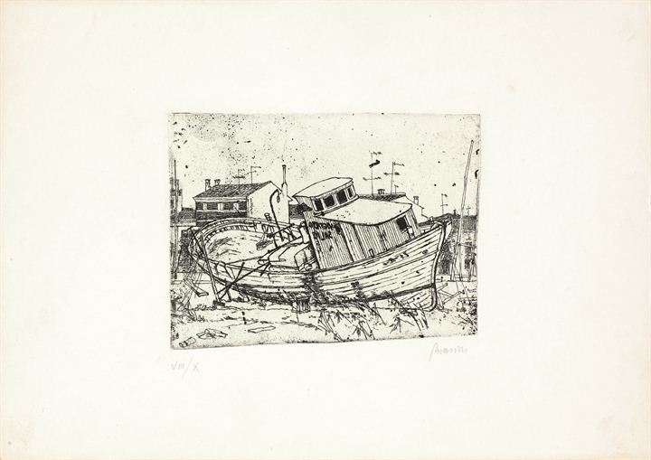 Lot 36 | BIASION RENZO Treviso 1914 - 1997 Firenze "Barcone in secca" 12,2x16,2...