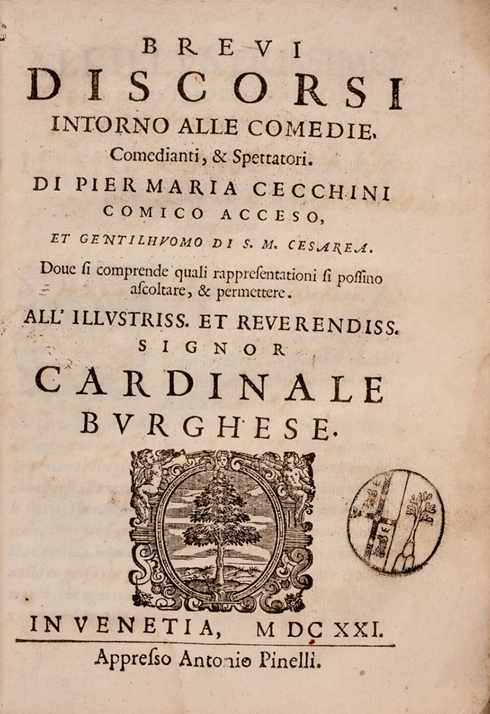 Terza edizione (dopo quella di Vicenza nel 1614 e di Napoli nel 1616) di questo importantissimo trattato in difesa dei comici e della onorabilità e liceità della loro professione, che seppur breve fornisce preziose informazioni sulla Commedia dell'Arte. Pier Maria Cecchini, in arte Frittellino, fu uno dei più eminenti attori di professione del suo tempo insieme alla moglie Orsola (Flaminia); l'Imperatore Mattia come segno di apprezzamento gli conferì, in occasione di una sua tournée a Vienna nel 1614, la patente di nobiltà di quattro quarti, che egli farà pubblicare in fine alle edizioni di questi suoi Brevi discorsi. Cecchini appartenne insieme a Giovan Battista Andreini e Niccolò Barbieri a quella che è stata definita la terza generazione della Commedia dell'Arte, «impegnata a trasformare in conquiste consolidate e regolari gli eccezionali successi dei predecessori, a rivendicare per la professione teatrale non più soltanto un posto fra le arti, ma una stabile funzione nella vita della città» (Taviani in DBI, ad vocem) e la strenua difesa della professione del comico avvenne anche e soprattutto attraverso la letteratura e le opere erudite. Cfr. Rasi I, 626 e segg.; manca a Piantanida.