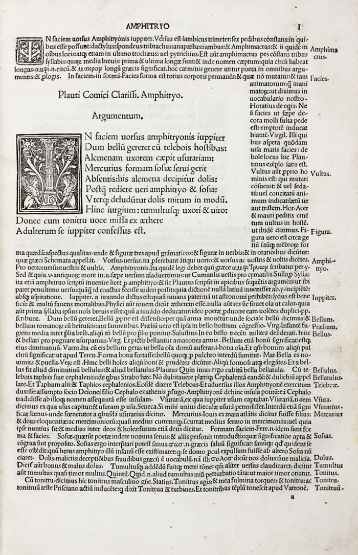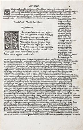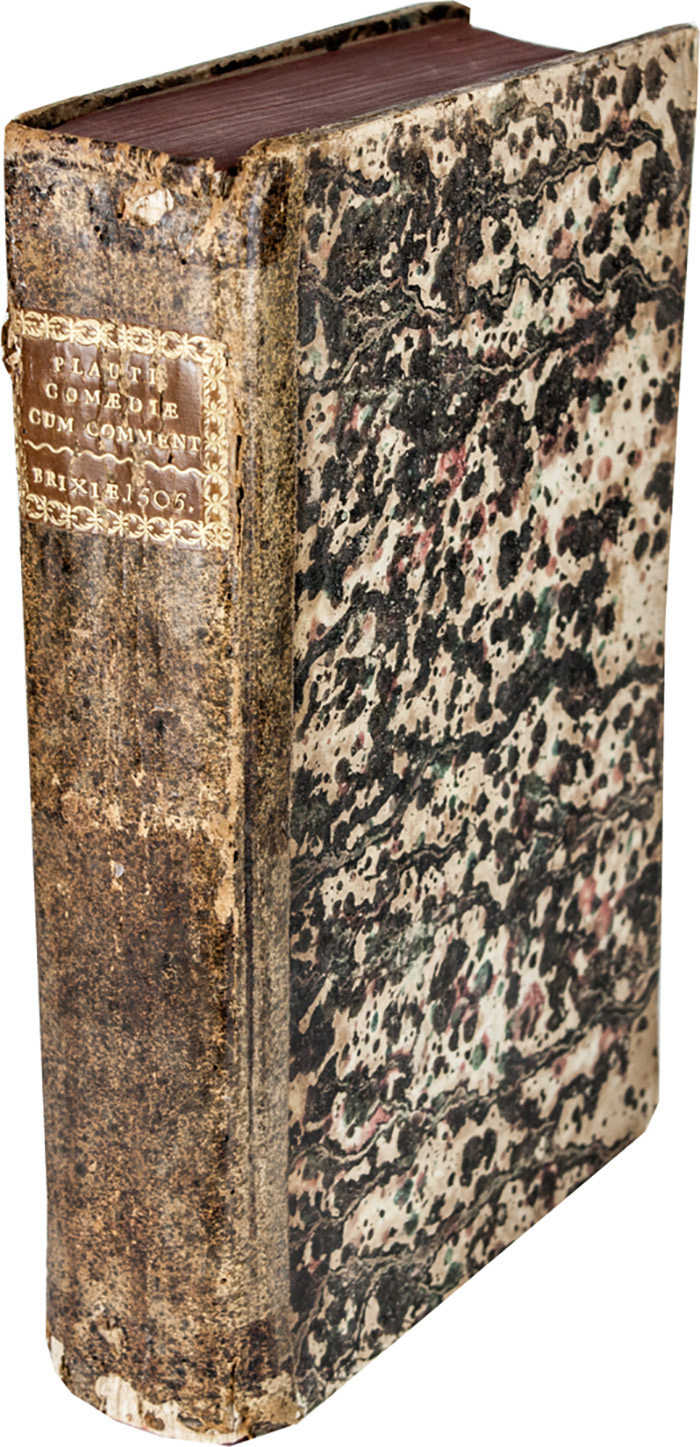 Prima edizione postuma estremamente rara del commento di Plauto dell'umanista Pilade Boccardo, grammatico e commentatore dei classici che aveva già collaborato con i Britannico per l'edizione latina delle Vite di Plutarco e quella di Macrobio. Boccardo intendeva riportare i versi plautini al metro antico allontanandosi dalla lezione del Merula, ma al momento della morte era riuscito a stabilire il testo di diciotto delle venti commedie e a commentarne soltanto cinque. Signaroli, Maestri e tipografi a Brescia 70: «L'ambizioso progetto di rivedere integralmente il testo delle venti commedie e di allestire un commento completamente nuovo si arrestò alla morte del grammatico. L'edizione che alla fine del 1506 Giovanni Britannico riuscì a portare sul mercato dopo averla annunciata cinque anni prima, nasceva orfana anche del tipografo che ne aveva iniziato l'allestimento, suo fratello Iacobo». L'edizione non ha frontespizio ma si apre con il Privilegio di stampa del dicembre 1506; titolo e dati editoriali si ricavano dal colophon. Manca ad Adams; Brunet IV, 707; Graesse V, 326; Sandal, La stampa a Brescia nel Cinquecento 56.