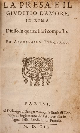 Poemetto estremamente raro, di cui non si conosce altra edizione e sconosciuto a tutti i principali repertori eccetto Brunet V 973. Arcangelo Tuccaro, lo straordinario acrobata abruzzese a lungo al servizio della corte di Francia e noto come il ‘saltarin du roi’ fu l’autore dei famosi Trois dialogues de l’exercice de sauter et voltiger en air editi a Parigi nel 1599, il primo e più importante trattato di ginnastica acrobatica del XVI secolo.