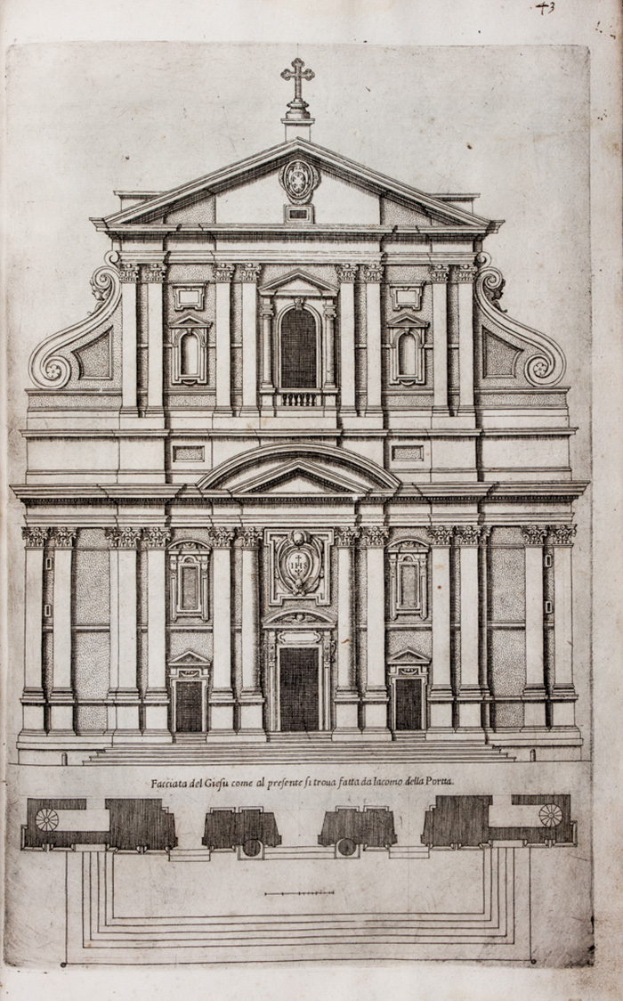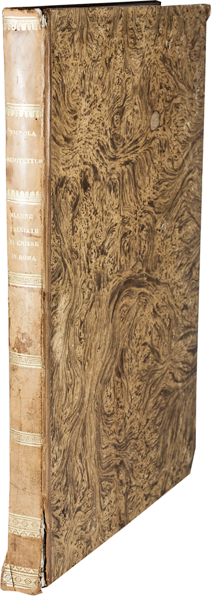 In-folio (mm 390x250). Pagine [4] e 48 calcografie. Frontespizio inciso in rame con gora d'acqua marginale e restauro. Restauro anche alla seconda carta di testo e a 13 tavole a seguito ad un massiccio lavoro di tarlo, evidenti gore d'acqua su tutta l'opera, alcune carte brunite e sporadiche fioriture. Nota manoscritta al frontespizio. UNITO A: Id., Alcune opere d'architettura [...] raccolte et poste in luce da Francesco Villamena. In Roma: [s.e.], 1617. Pagine [2] e 46 tavole calcografiche. Frontespizio inciso in rame. Gore d'acqua e restauri a quattro carte anche piuttosto evidenti. Legatura ottocentesca in mezza pelle con cerniere lise e minime abrasioni ai piatti.