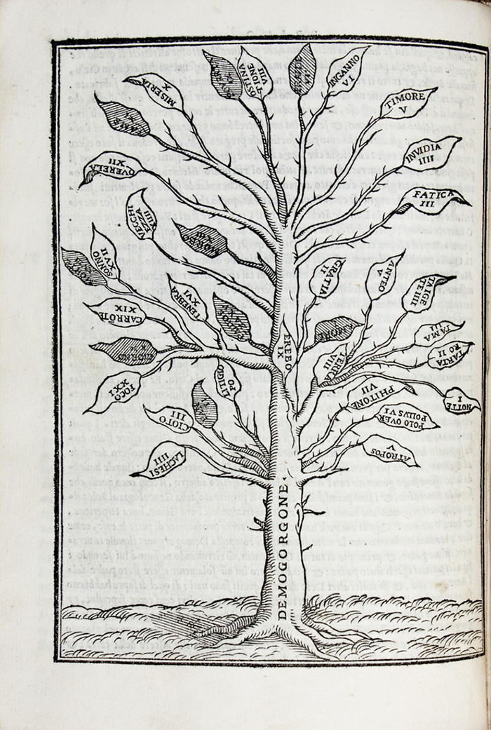 In-4° (mm 210x148). Carte [20], 263, 1 bianca. Marca dello stampatore al frontespizio, capilettera figurati e una bella tavola di albero genealogico a carta 5v a piena pagina nel testo, il tutto inciso in legno. Macchie, abrasioni e altre mende al frontespizio, foro di tarlo con perdite a 3 carte iniziali e finali, lievi arrossature sparse e qualche gora d'acqua marginale, inoltre alle ultime 30 carte il margine esterno presenta una piccola lacuna dovuta a un roditore. Legatura moderna con dorso in pergamena antica, titoli dorati su tassello al dorso.