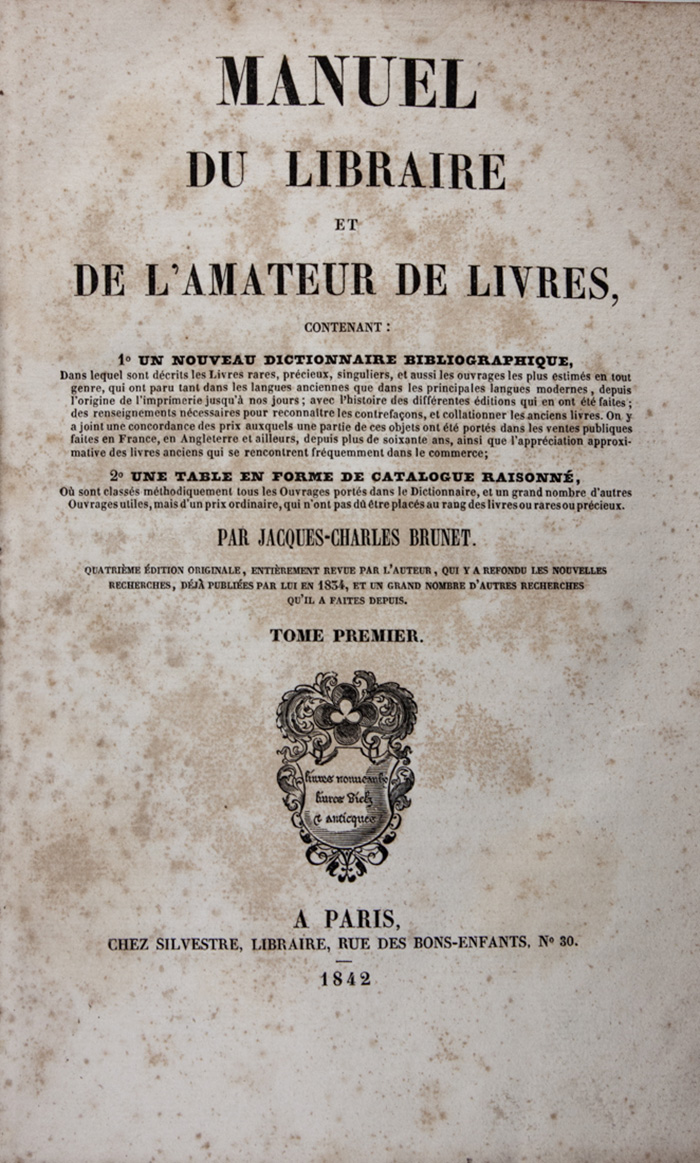 Brunet Jacques-Charles, Manuel du libraire et de l'amateur de livres [...]. Tome premier (-cinquième).