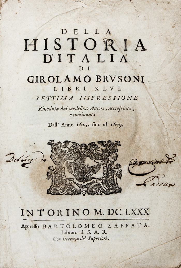 Brusoni Girolamo, Della Historia d'Italia [...] libri XLVI. Settima impressione riveduta dal medesimo Autore, accresciuta, e continuata dall'anno 1625 fino al 1679.