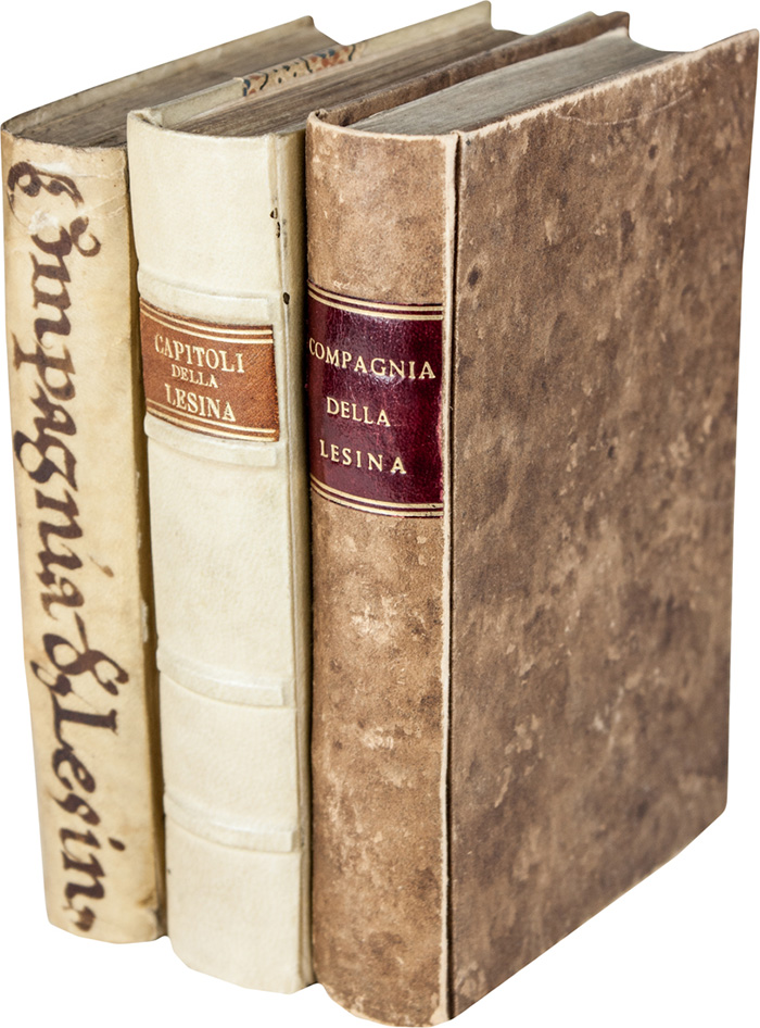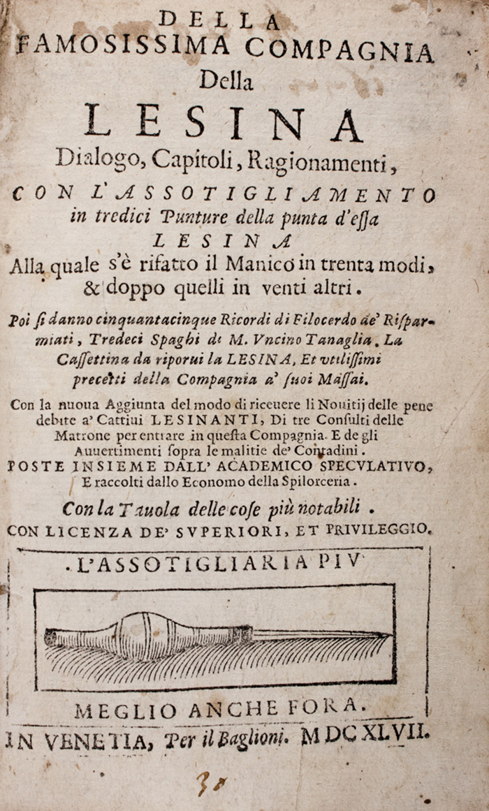 Due parti in un volume in-8° (mm 145x95). Carte [8], 109, [3]; 82, [2]. Frontespizio con emblema della Compagnia della Lesina. Qualche gora e fioritura sporadica. Alcune carte lievemente più brunite, ma copia in buono stato di conservazione. Legatura ottocentesca in mezza pergamena rigida con punta e carta marmorizzata. Piccoli fori di tarlo alle cerniere. SI AGGIUNGE: Id., Della famosissima compagnia della Lesina dialogo, capitoli, ragionamenti...In Venetia: appresso Gio. Battista Bonfadino, 1619. Due parti in un volume in-8° (mm 145x95). Carte [8], 109, [3]; 82. Esemplare sprovvisto delle ultime carte bianche. Lavoro di tarlo con perdita di testo al frontespizio e alle prime carte. Gore d'acqua e brunitura più evidente alla seconda parte. Legatura in piena pergamena con titoli manoscritti al dorso. Lavoro di tarlo al piatto anteriore. SI AGGIUNGE: Id., Della famosissima compagnia della Lesina dialogo, capitoli, ragionamenti... In Venetia: per il Baglioni, 1647. In-8° (mm 148x95). Carte [8], 192. Piccole macchie e lievi fioriture. Legatura novecentesca in cartone con tassello di pelle al dorso. (3)
