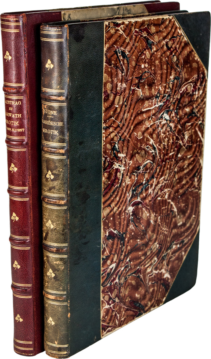 In-4° (mm 280x200). Pagine 158, [2] con 90 illustrazioni anche a piena pagina. Esemplare numero 275 su una tiratura limitata non destinata al commercio. Legatura in mezza pelle con dorso a cinque nervi e titoli e fregi dorati. Lievi abrasioni lungo le cerniere e ai piatti, ma ottimo stato di conservazione. SI AGGIUNGE: Karwath Cary von, Die Erotik in der Kunst. Illustrativer Nachtrag. Wien: C.W. Stern, 1908. In-4° (mm 285x215). Carte 51 con 48 tavole anche a colori. Mancanti le tavole numero 19 e 20. Legatura in mezza pelle rossa con dorso a cinque nervi e titoli e fregi dorati. (2)