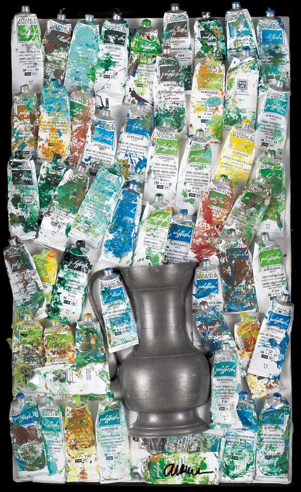 ARMAN Nizza 1928 - New York 22/10/2005 - Senza titolo, 1998, caraffa tagliata e tubetti di colore acrilico su tela applicata su tavola cm. 54x32, firma in basso al centro, opera registrata presso l'Archivio Arman come da dichiarazione a cura della Galleria Dante Vecchiato (PD) su foto.