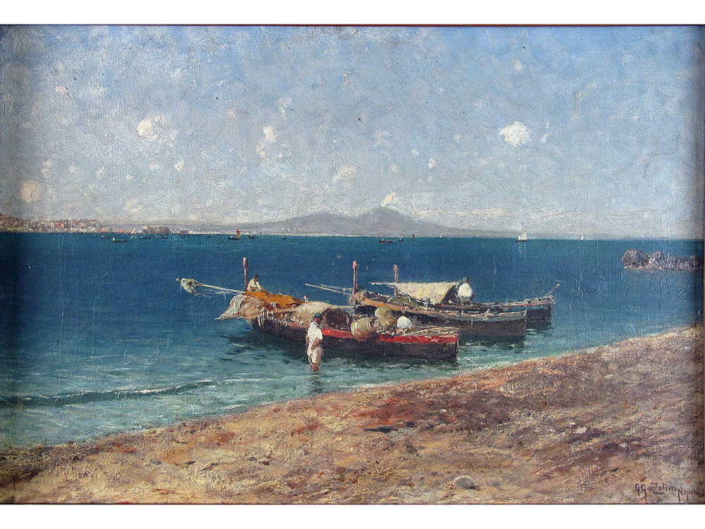 Giuseppe Garzolini (1850-1938) Golfo di Napoli con pescatori 30x45,5 cm Olio su tela