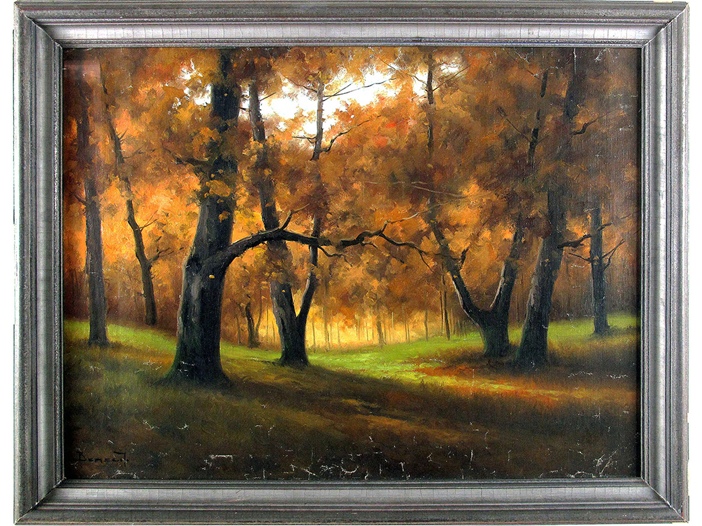 Firma illeggibile (XX secolo) Riflessi di luce nel bosco 60x79 cm Olio su...