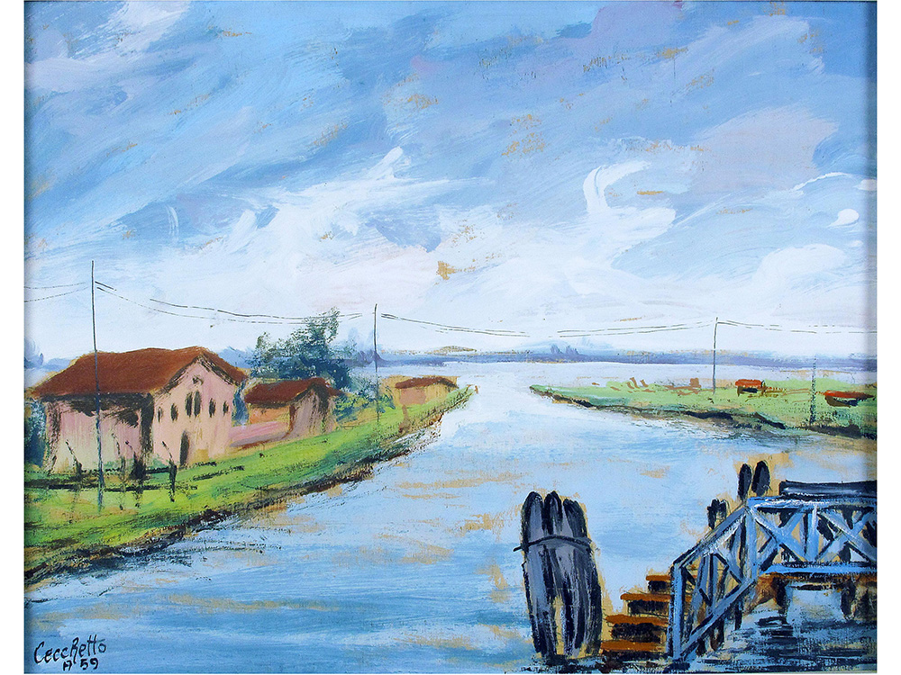 Cecchetto A. (XX secolo) Paesaggio lagunare 30x40 cm Olio su compensato