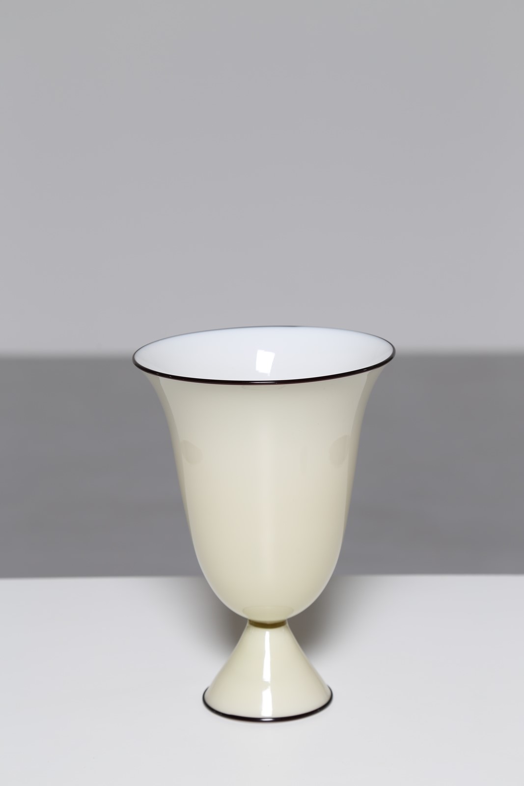 ZECCHIN VITTORIO (1878 - 1947) Vaso a coppa incamiciato color avorio con bordo in pasta nera, Murano anni 30. 1930. . Cm 16,70 x 23,50.