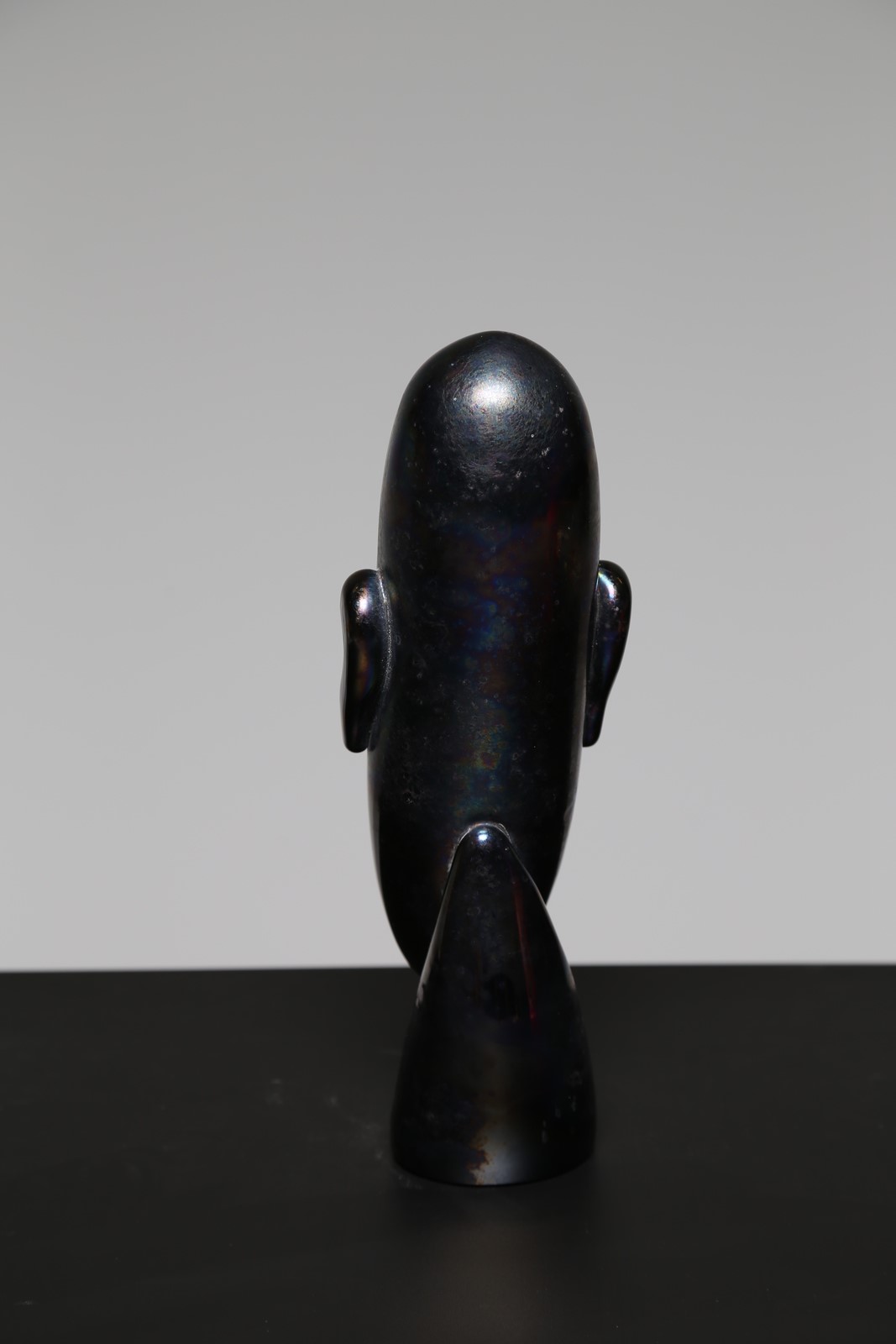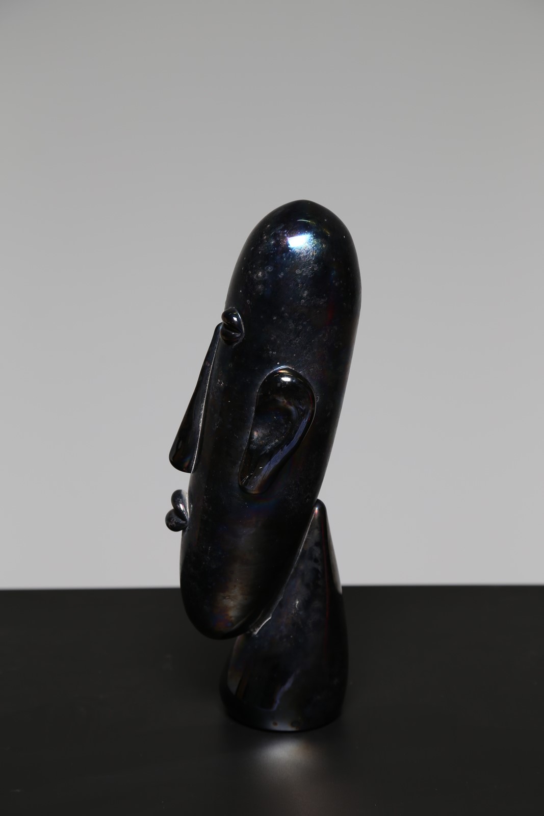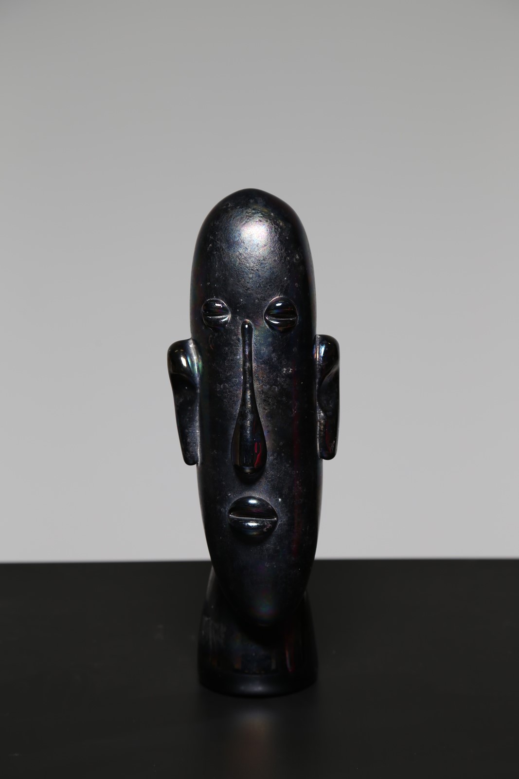PURISIOL ERNESTO Viso oblungo in vetro nero iridato, ispirato dalle sculture dell'isola di Pasqua, per Cristalleria del Maestro Alfredo Rossi in Murano. -. Cm 10,00 x 32,00 x 11,00. Firma presente alla base