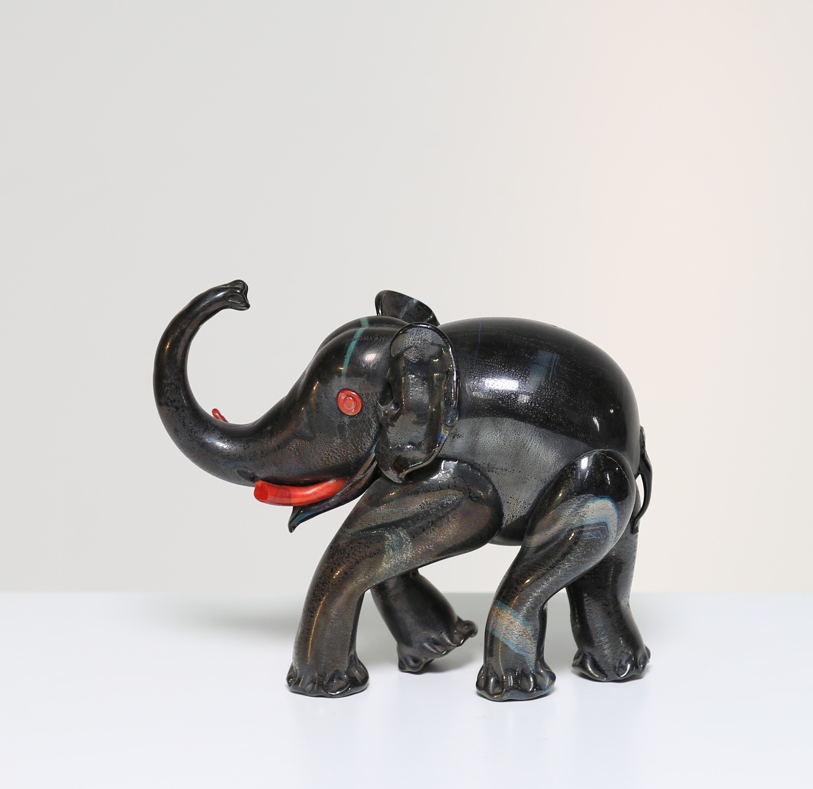 CAPPELLIN M.V.M Elefante in vetro di Murano in pasta nera e rossa a foglia argento per MVM Cappellin anni 30°. -. Cm 22,00 x 18,00 x 10,00. Zanna spezzata