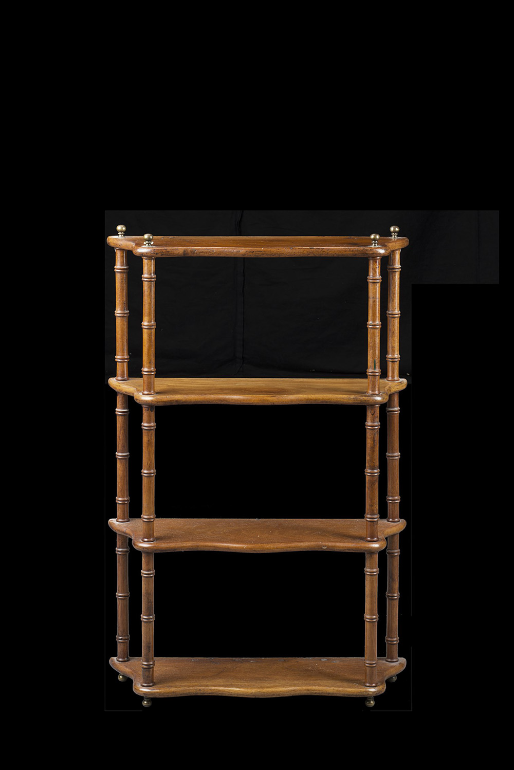 Etagere pensile a quattro ripiani di forma mossa con montanti torniti terminanti a pinnacoli in metallo (48x75x15)