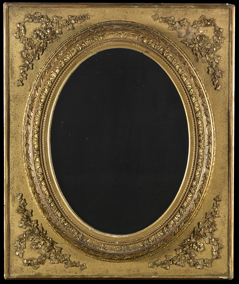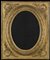 Specchiera ovale in legno intagliato e dorato, la parte centrale a rilievo con foglie d'acanto e perlinatura. Sec. XIX (cm 57x48) (difetti)