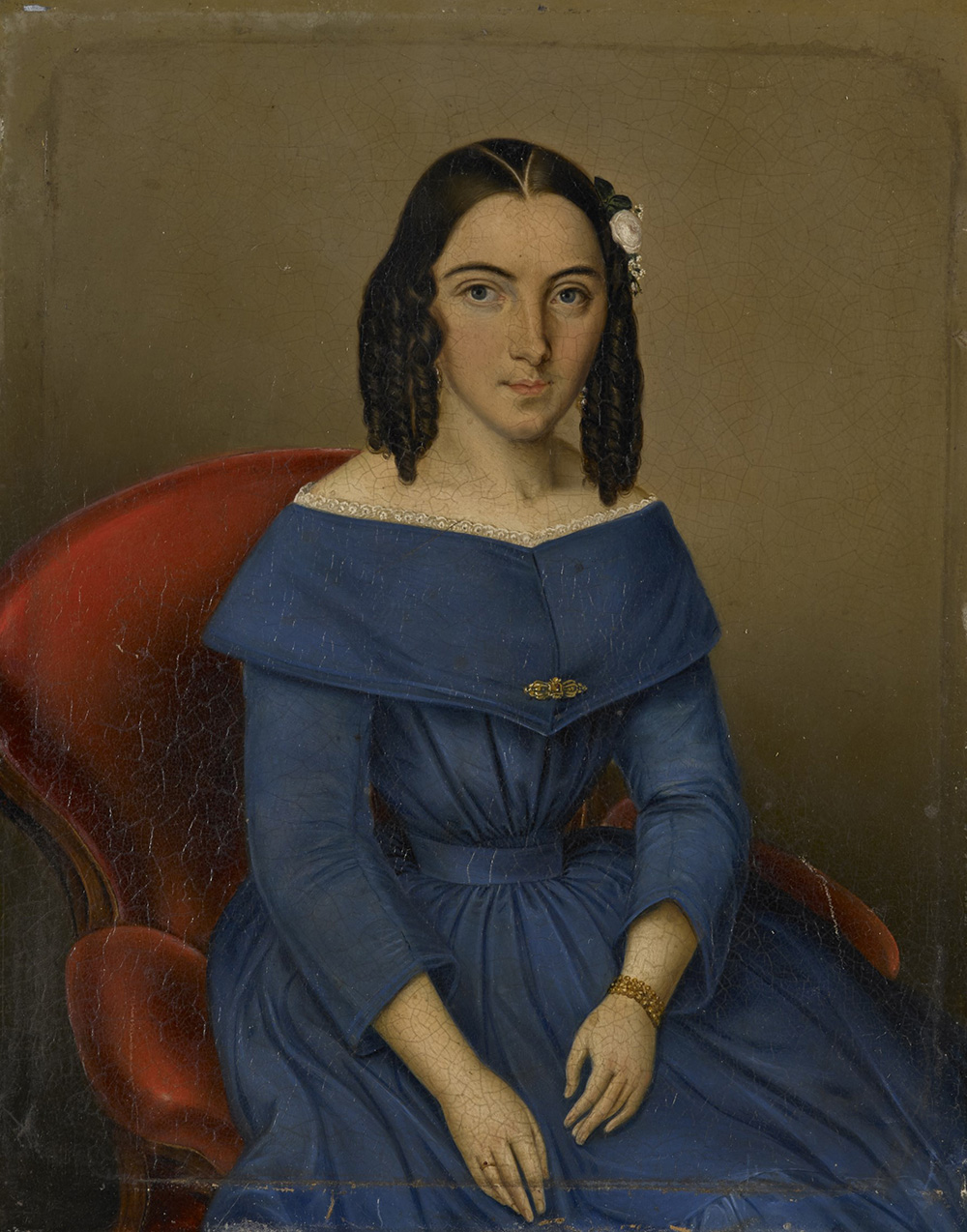 School of the 19th century "Portrait of a young girl wearing a blue dress" oil on pressed cardboard (cm 15x11.5) Framed (defects)