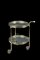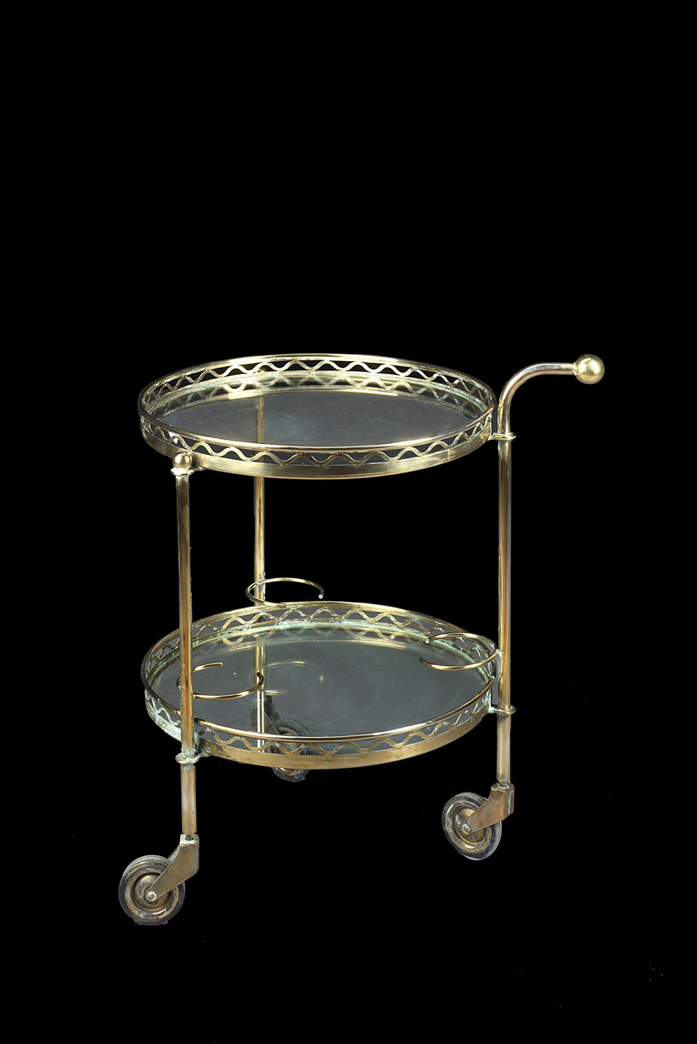 Carrello portabottiglie circolare a due ripiani decorato a ringhiera traforata ripiani in vetro. Piedi muniti di rotelle (h. cm 61 x d. cm 47)