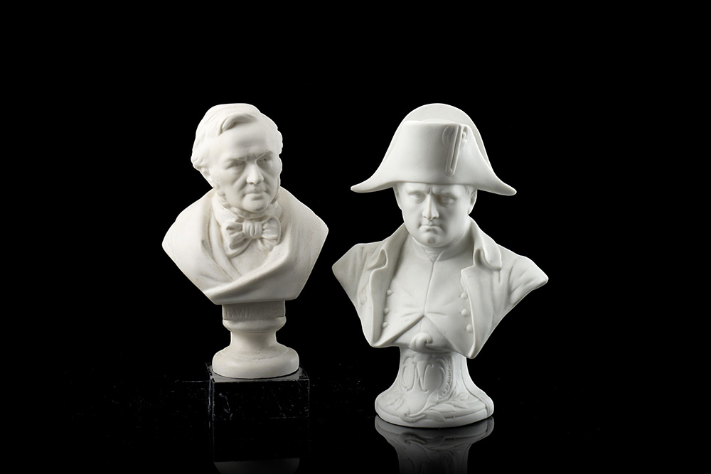 Busto in gres raffigurante Wagner su base in marmo nero; unito a un busto di Napoleone (h. cm 16 e h. cm 16) (difetti)