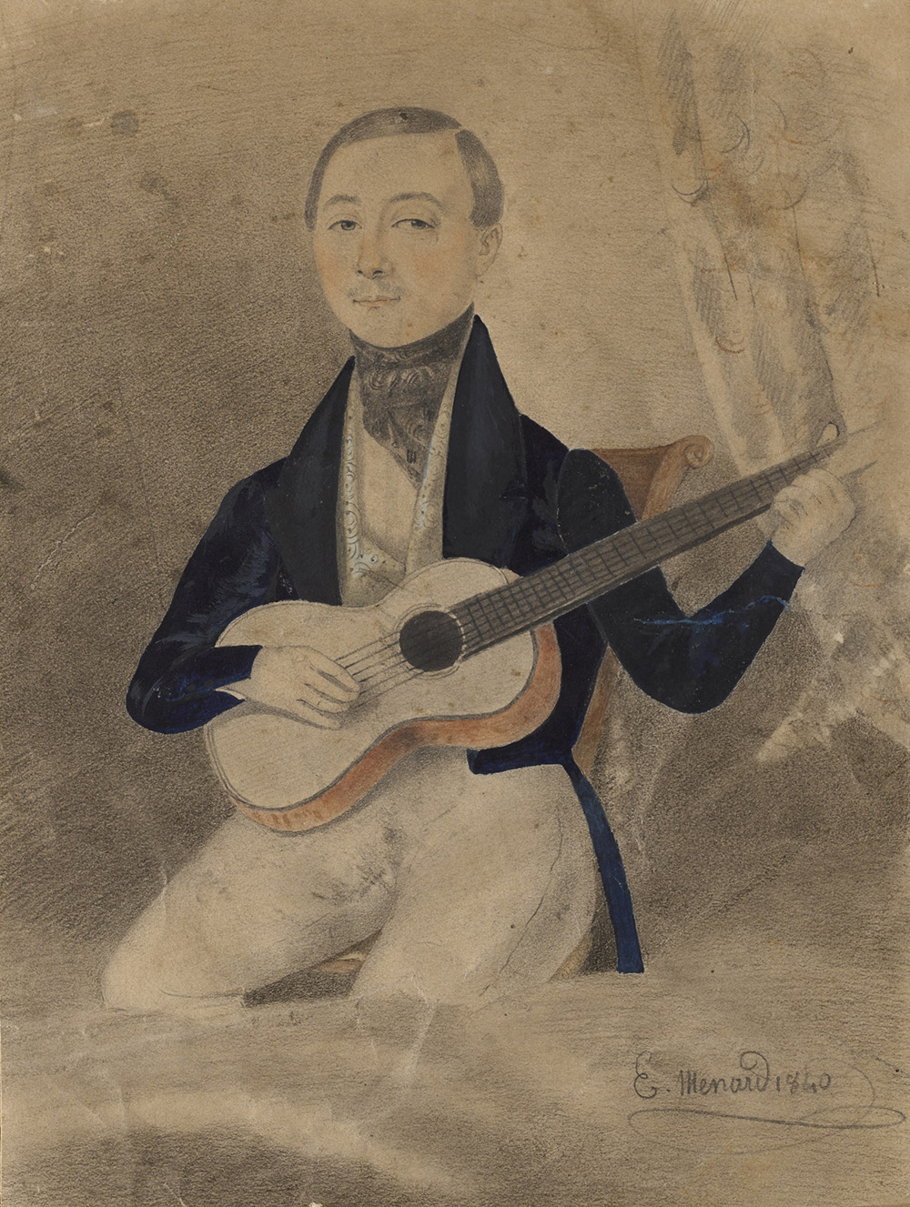 E. Menard (19th century) "Portrait of a Musician" mixed media on paper (cm 22,5x17) Signed and dated 1840 at bottom right. Framed (defects)