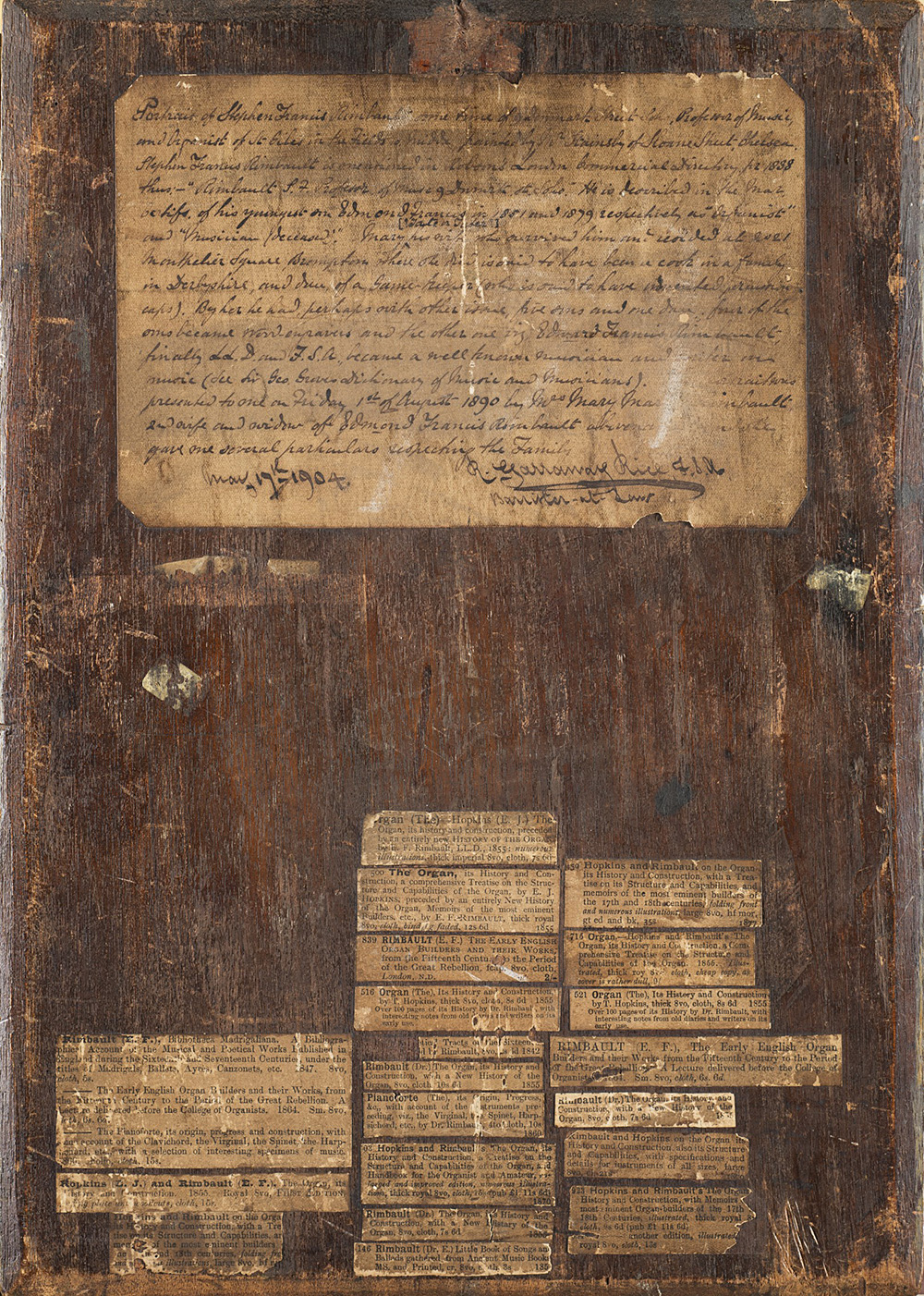 School of the 19th century "Portrait of Stephen Francis Rimbault" Oil on panel (cm 40x28.5) label to reverse. Framed (defects)
