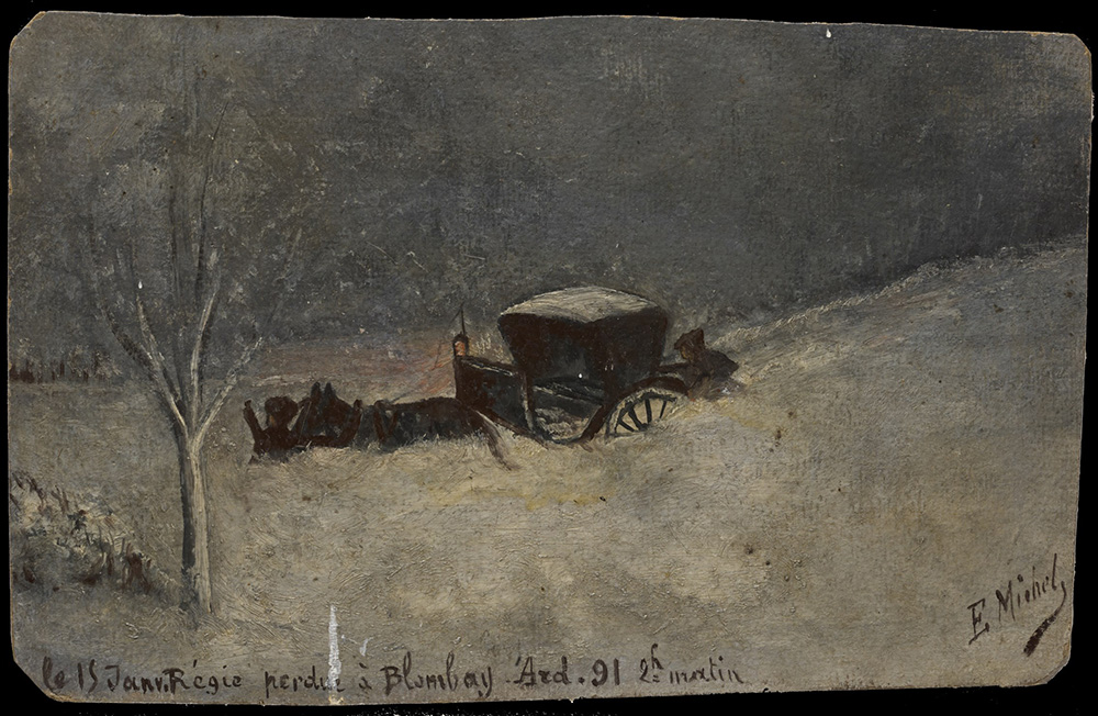 (?) "Le 15 Jan. Régio perdus à Blombay Ard. 91 2h matin" oil on shaped cardboard (cm 18x28.5) Signed and titled at bottom. Framed (defects)