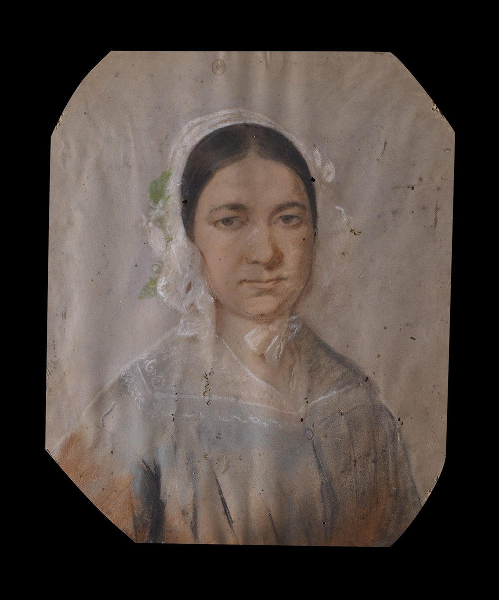 Scuola del sec. XIX "Ritratto di donna con cuffia e fiori" pastelli...