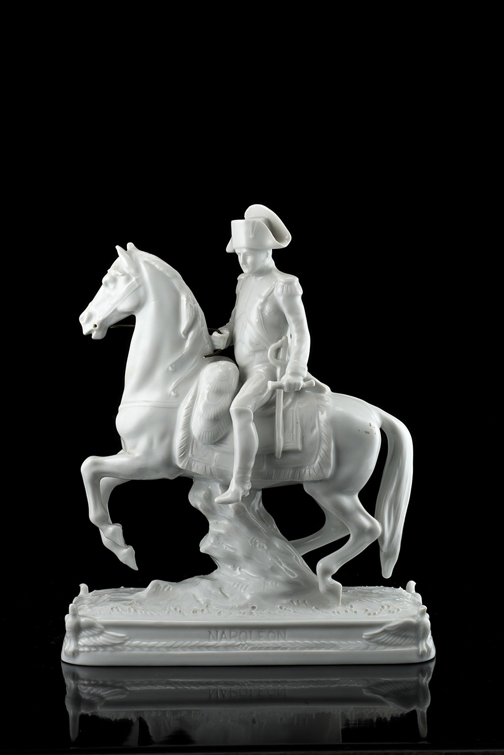 Manifattura del sec. XX. Gruppo in porcellana bianca raffigurante Napoleone a cavallo (h. cm 22) (difetti)