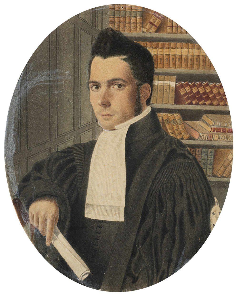 School of the 19th century "Portrait of a Notable" watercolour on oval paper (cm 16.5x12) Framed (defects)
