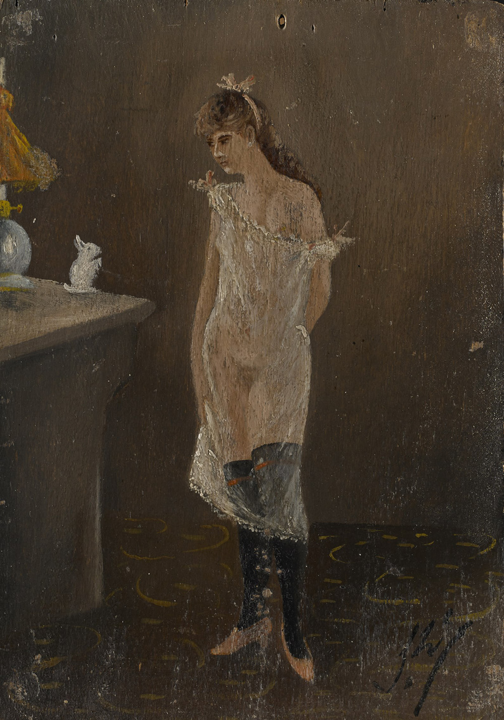 Undeciphered signature "Girl" oil on board (14x9) Initialled at bottom right. Framed (defects)