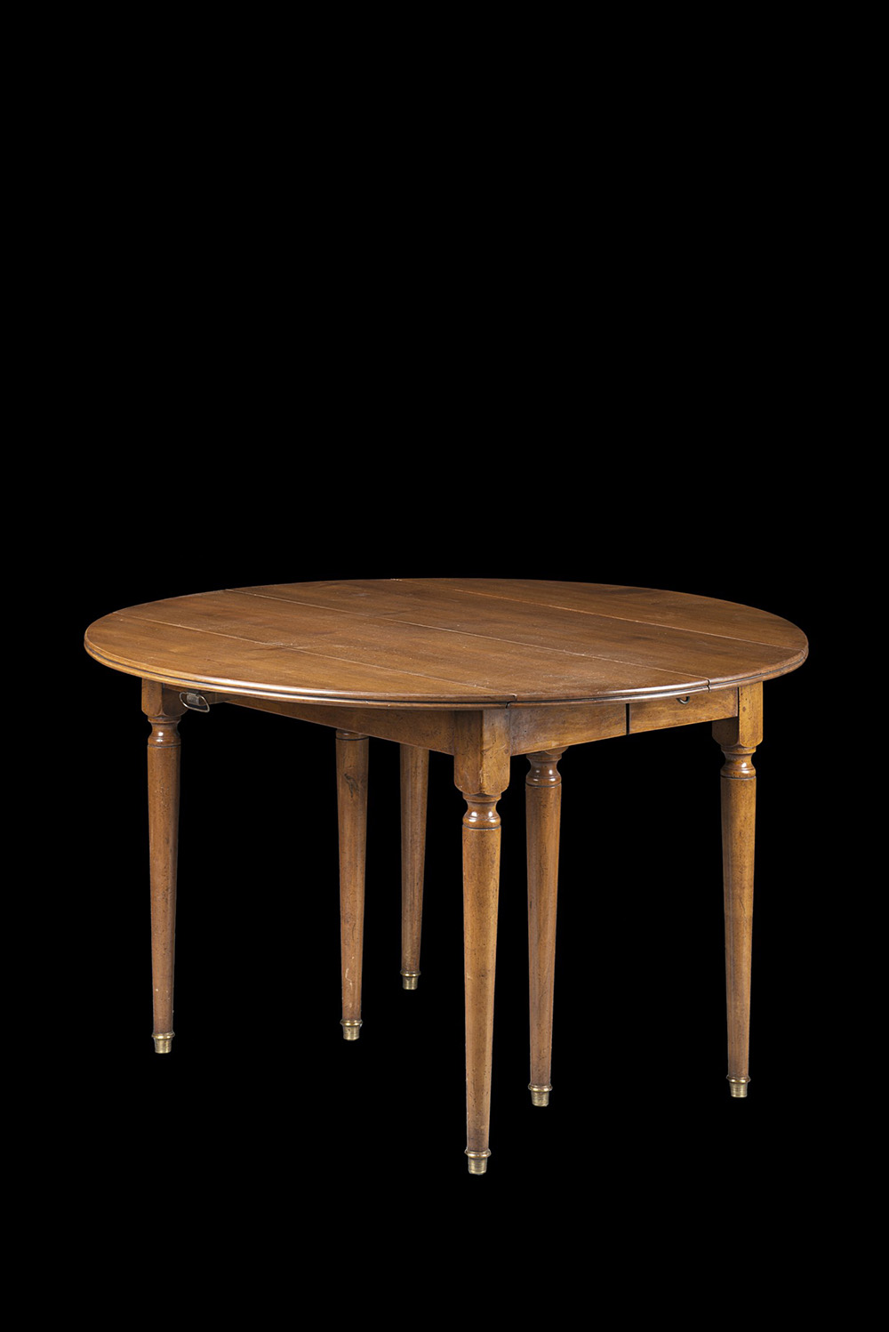 Extendable dining drop-leaf table, six turned legs with bronze sabots. 19th century (d. cm 124 x h. cm 73) With extension (defects)