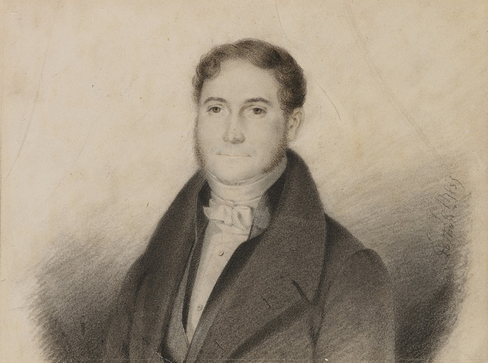 Undeciphered signature, 19th century "Gentleman in a Black Suit" mixed media on paper (cm 14x19) Signed and dated 1835 at bottom right. Framed