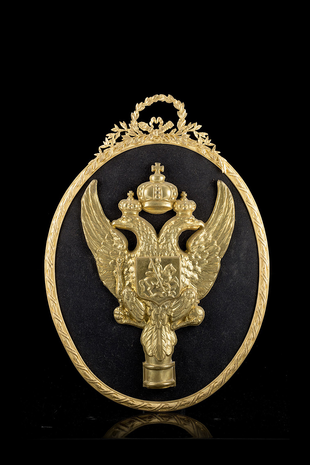Puntale decorativo con le insegne dell'Impero Russo e dei Romanov in metallo dorato su pannello in velluto. In cornice in metallo dorato (h. cm 40)