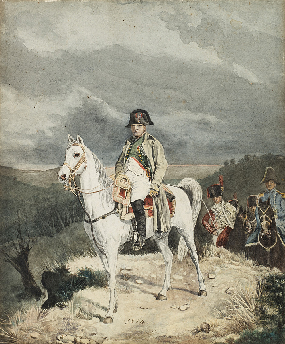School of the 19th century "Napoleon on Horseback" watercolour on paper (cm 29x23.5) dated 1814 initalled at bottom left. Framed (defects)