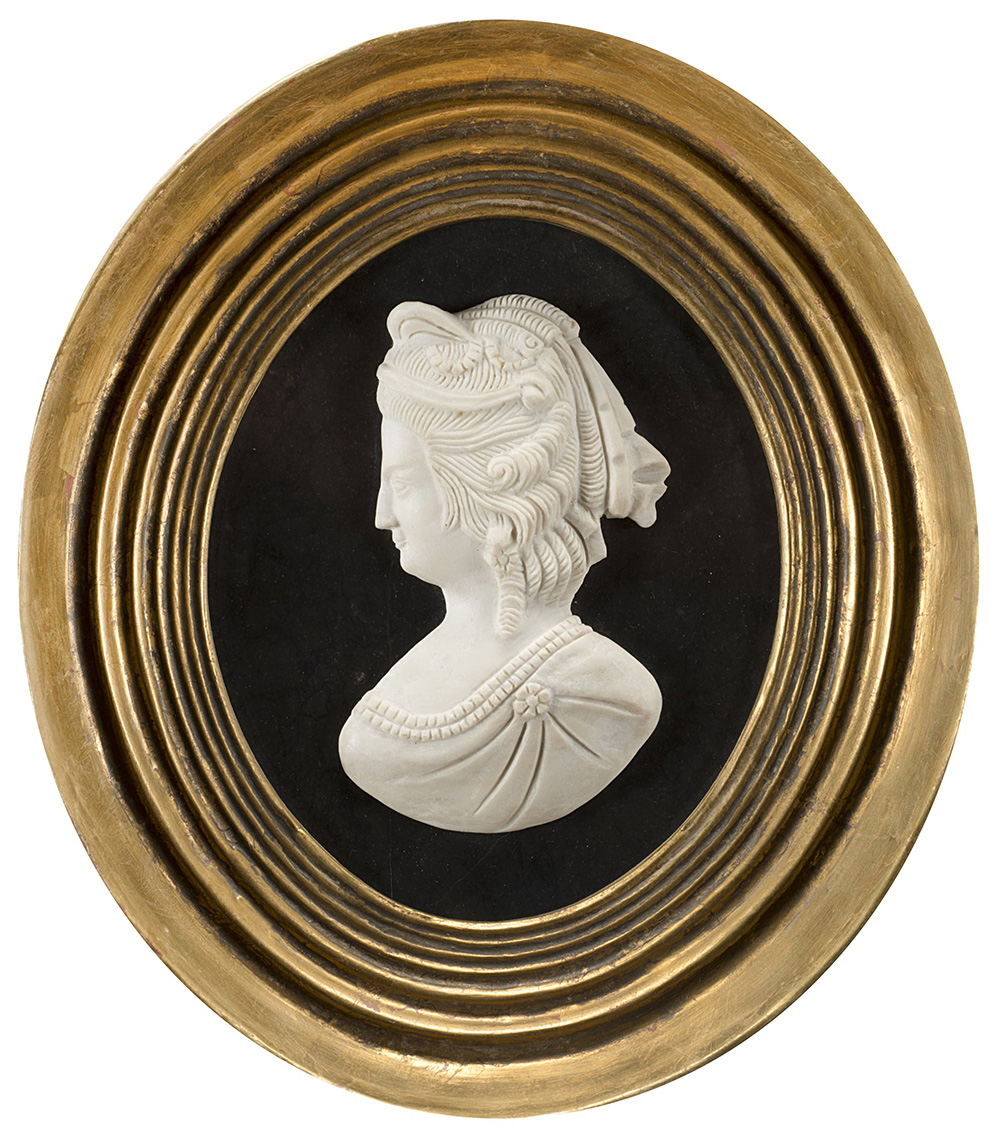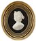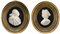 Coppia di bassorilievi in marmo bianco raffiguranti regnanti francesi su fondo in pietra di paragone (cm 15x13) Sec. XIX. In cornice in legno dorato (lievi difetti)