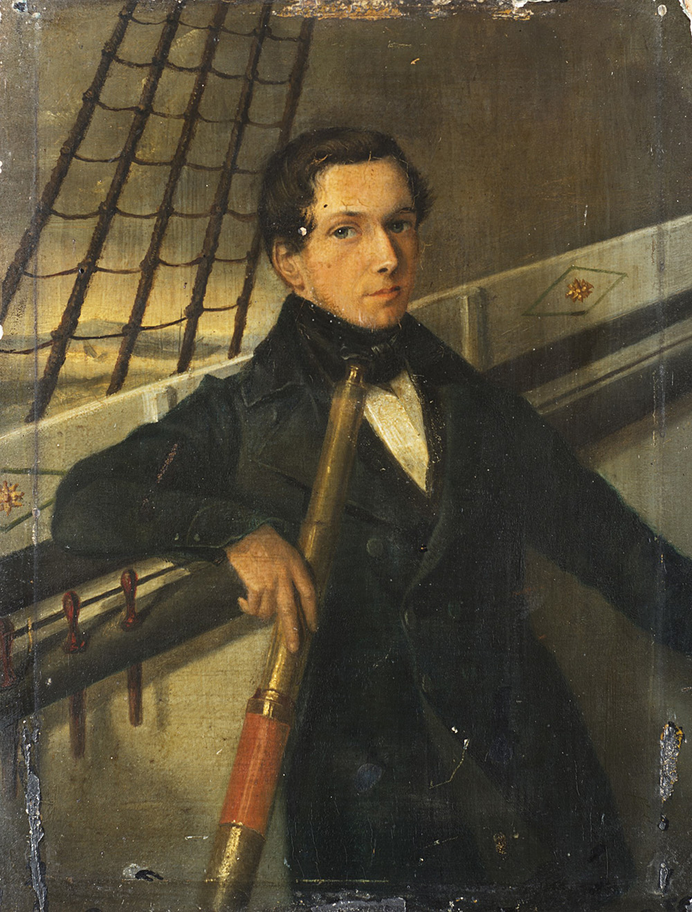 Scuola del sec. XIX "Ritratto di gentiluomo con cannocchiale" olio...