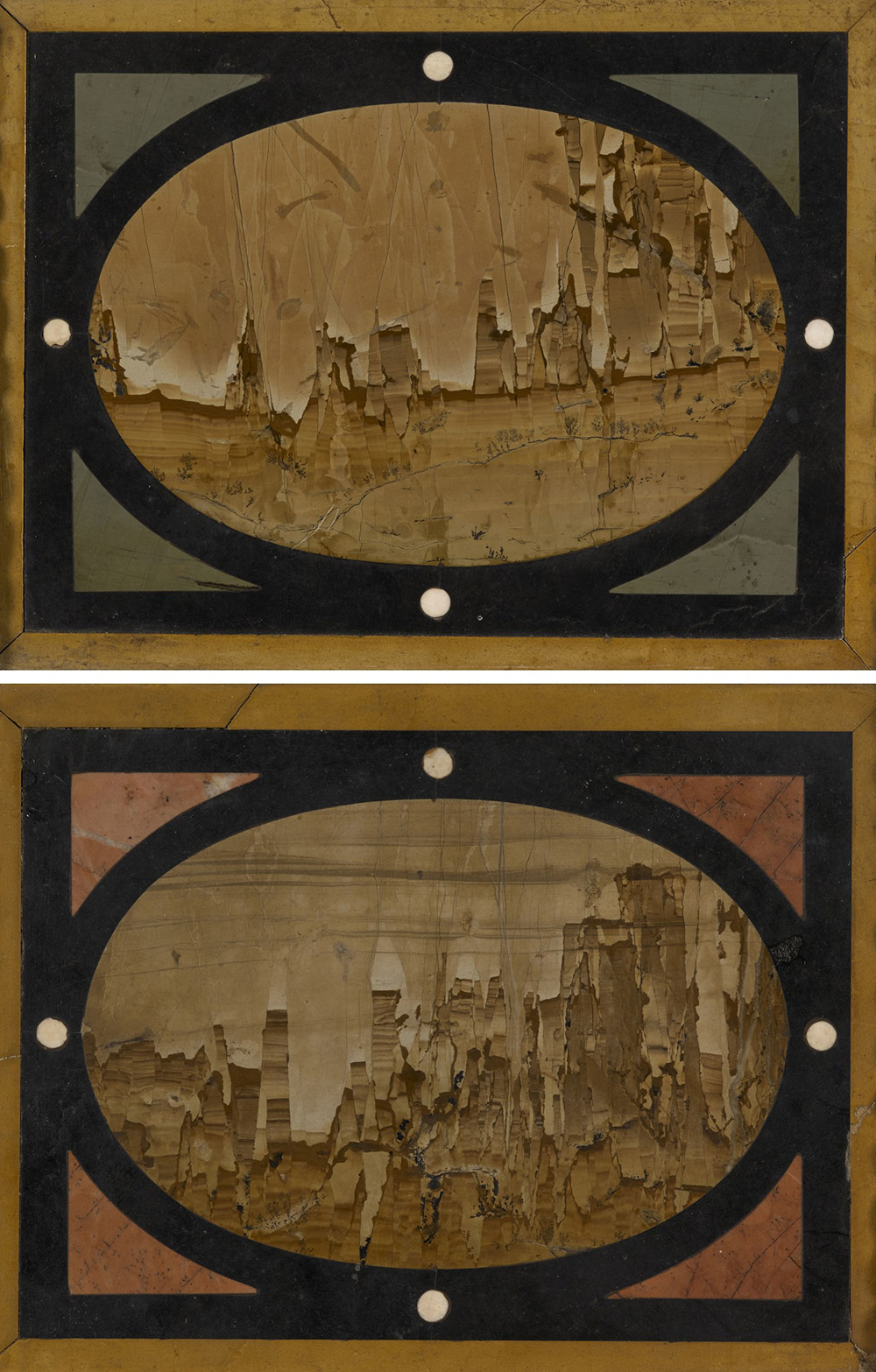 Coppia di antiche commesse in pietra paesina e marmi (cm 10x12,5) In cornici ebanizzate