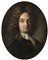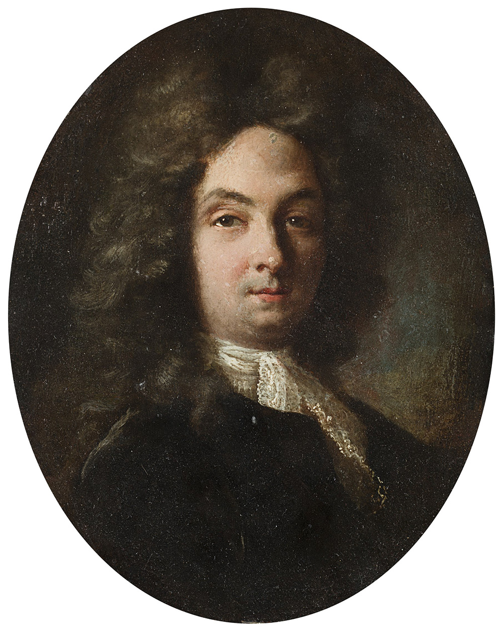 Scuola della fine del sec. XVIII "Ritratto di gentiluomo in parrucca" olio su rame sagomato (cm 17,5x13,5) Montato su supporto in velluto, in cornice del sec. XVIII (difetti e restauri)